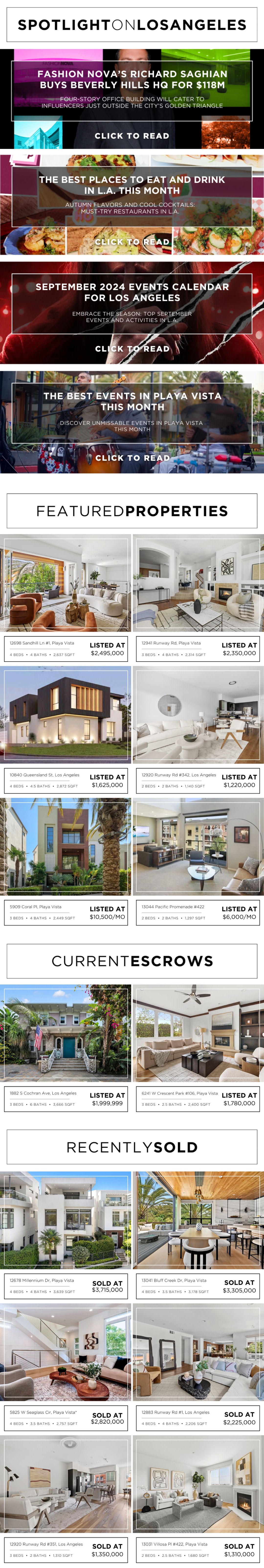 September brings continually declining mortgage rates, which remain flat at its lowest rate in over a year at 6.35% for the 30-year fixed mortgage. However, the decreasing interest rates have not improved summer home sales with the numbers of homes sold in Los Angeles decreasing 1.8% and inventory increasing 7.2% from July 2024 to August 2024, according to the MLS. Buyers have been extremely cautious this summer, ensuring to engage in only the best real estate deals. As such, many of our clients eagerly await the outcome of the Fed’s meeting next week and its impact on mortgage rates to determine their next real estate decision.